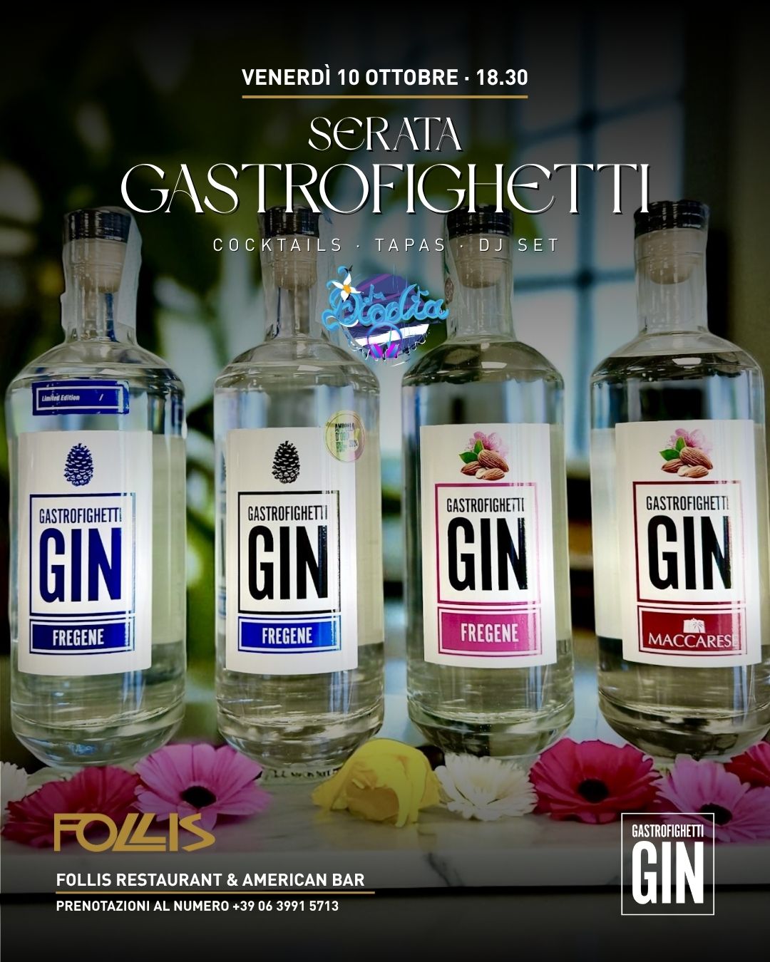 Gin Night con Gastrofighetti - Venerdì 10 Ottobre Una serata speciale dedicata agli amanti del gin e dei sapori ricercati! Follis ospita Gin Gastrofighetti per una noche all'insegna della mixology d'autore. Dietro al bancone, la crew composta da Samantha Parente, Claudia Bonanni e Try To è già al lavoro per creare cocktail esclusivi che sapranno sorprenderti. Ogni drink è pensato per esaltare